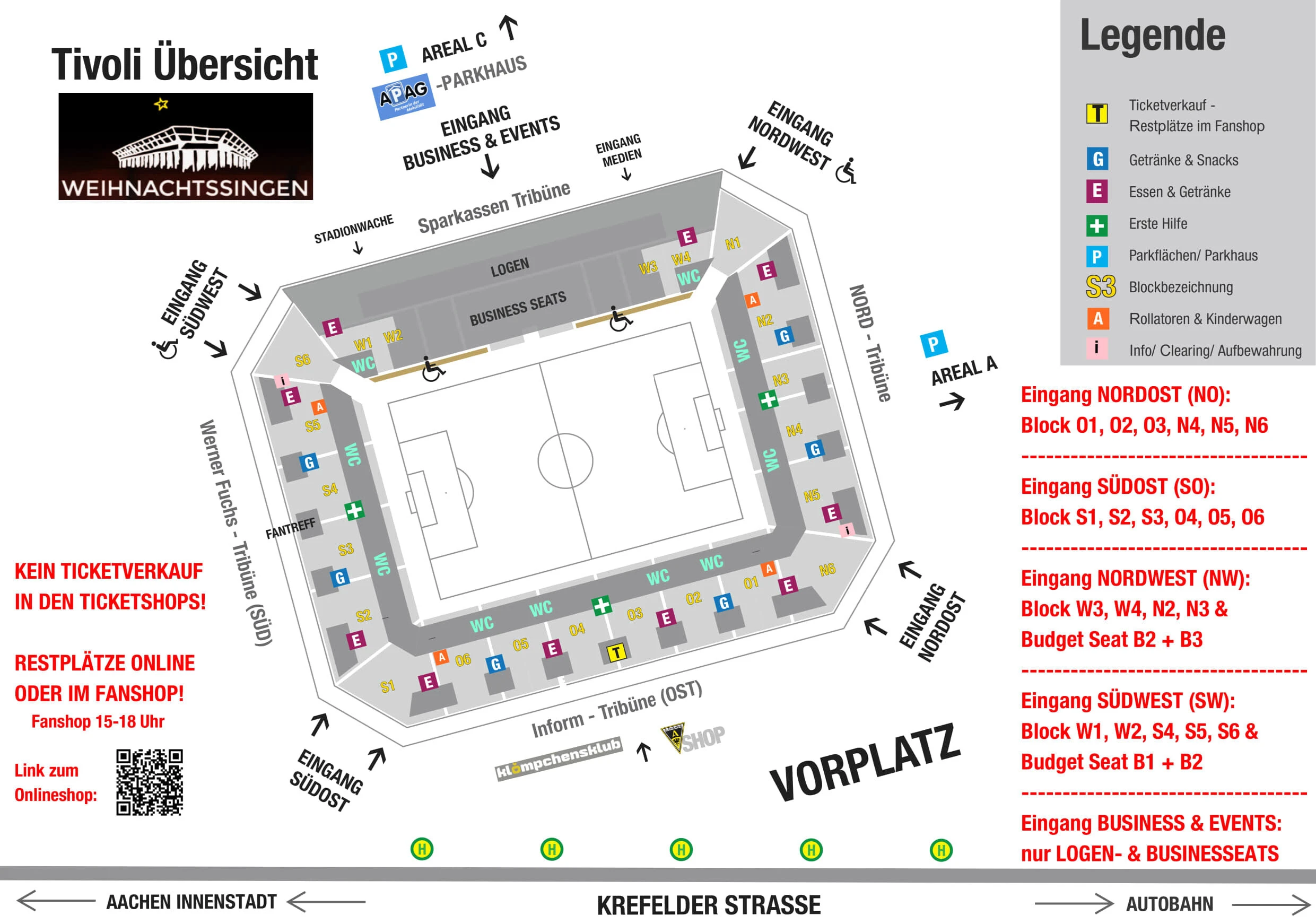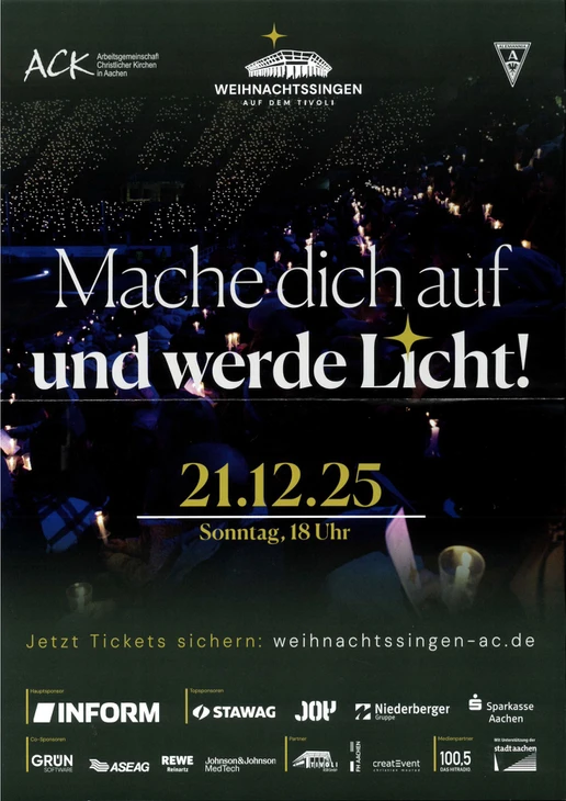Auch in diesem Jahr freuen wir uns, dass wieder ein Weihnachtssingen auf dem Tivoli stattfinden wird. Eine schöne Gelegenheit, das Jahr ausklingen zu lassen. Eine sehr beliebte Veranstaltung für Jedermann. Die Tribünen im Stadioninnenraum werden getaucht in ein Meer aus Kerzenlicht und auf dem Rasen wird eine tolle Lichtinszenierung dargeboten - eine tolle Kulisse und ein einmaliges Erlebnis. Das Singen findet am 3. Adventssonntag, dem 21. Dezember 2025 statt. Der Kartenvorverkauf hat bereits begonnen.